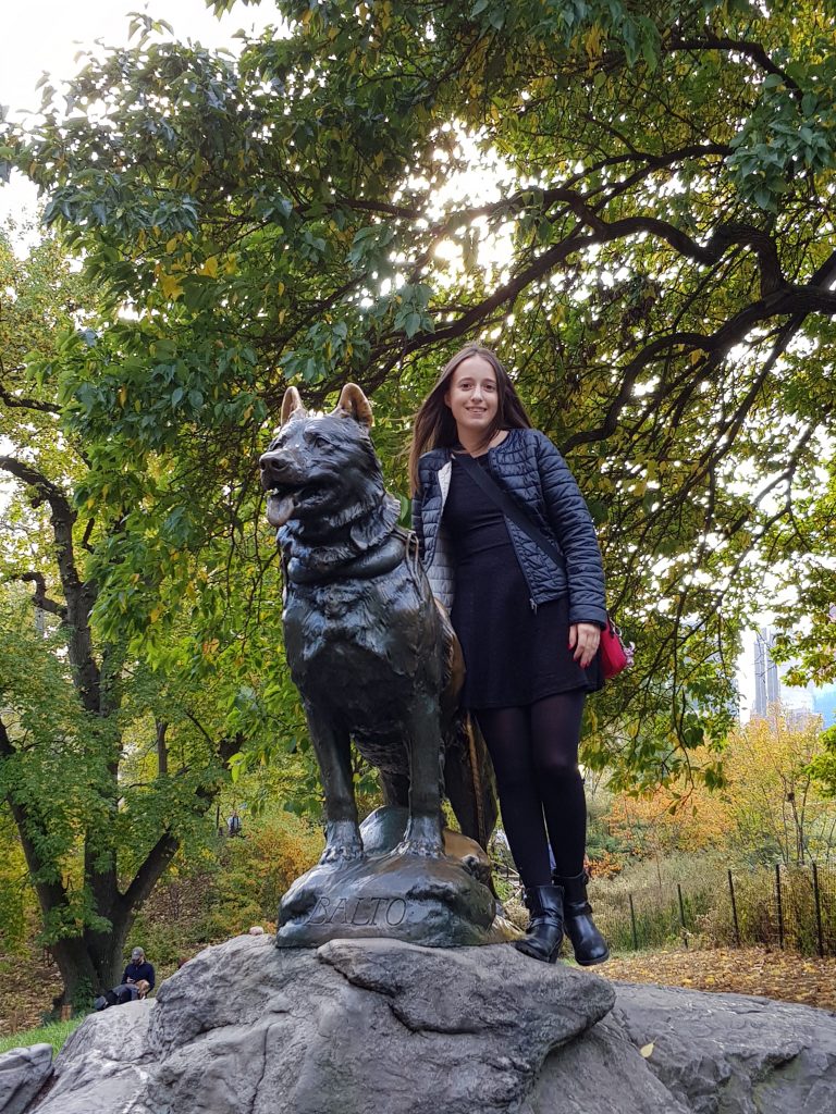 Uno dei luoghi che più sognavo pensando a New York è Central Park, visto e rivisto in centinaia di film in tutto il suo splendore, con la neve, con il sole, con le foglie che cadevano. Scegliendo il periodo in cui visitare New York ammetto di aver pensato anche a quale stagione sarebbe stata l’ideale per una visita a Central Park e la mia scelta è ricaduta sul mese di ottobre, per poter vedere il parco colorato di rosso, arancione e giallo in occasione del foliage, il nome con cui viene definito il fenomeno degli alberi che cambiano vesti e colori nel periodo autunnale. Quando percorrendo la 7th Av. da Times Square ho iniziato ad intravedere in lontananza le carrozze con i cavalli che preannunciavano l’arrivo a Central Park, ho realizzato che il mio sogno si stava finalmente realizzando. Per godermi appieno questo magnifico parco ho deciso di noleggiare la bici per una giornata intera, scelta azzeccatissima! Nei pressi del parco ci sono numerose società di noleggio; io mi sono affidata alla Central Park Sightseeing (56 West 56th Street ), a due passi dall’ingresso Sud del parco, scelta “obbligata” in quanto il noleggio era gratuito ed incluso nel nostro New York Pass. Armata di bici e non senza un po’ di paura di cadere/essere investita/uccidermi in qualche modo ho iniziato il mio tour del parco, iniziando dall’ingresso Sud. La prima cosa importante da sapere prima di avventurarsi con la bici a Central Park è che il senso di marcia è unico e la pista ciclabile, di forma ellittica, percorre l’intero parco in senso antiorario. Fanno eccezione alcune vie trasversali, in genere in corrispondenza di punti d’interesse e attrazioni, che possono essere percorse in entrambi i sensi di marcia e che permettono, ai più pigri, di tagliare il percorso ed accorciarlo. Studiate bene la mappa che vi sarà consegnata al noleggio bici per verificare dove si trovano questa “scorciatoie”. Una volta che le avrete superate, non potrete far altro che proseguire nel percorso o tornare indietro a piedi, spingendo la vostra bicicletta. E qui arriva la seconda regola di Central Park: non è possibile andare in bicicletta al di fuori delle aree adibite al transito ciclabile. Se volete addentrarvi in zone solo pedonali, parcheggiate la vostra bici e riprendetela quando siete pronti a riprendere il giro. Partendo da Sheep Meadow, un enorme prato in cui potrete fermarvi a fare un picnic nelle giornate di sole, una delle prime attrazioni che incontrerete farà riemergere ricordi nostalgici se, come me, vi siete emozionati guardando il film di Balto. Nel parco si trova, infatti, la statua del cane-eroe che compare nelle scene iniziale e finale del film d’animazione.