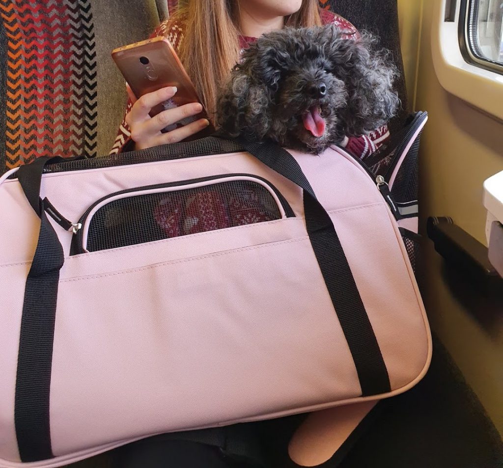 Se avete un cane di piccola taglia e dovete acquistare un trasportino, vi consiglio di scegliere una borsa semirigida che lasci sufficiente spazio al vostro cagnolino per muoversi ed alzarsi. Un’altra caratteristica importante che deve avere il trasportino sono le aperture, che gli permettano di tirare fuori la testa. Nella foto che trovate più in alto potete vedere la borsa che abbiamo scelto per viaggiare in treno con la nostra Lizzie.