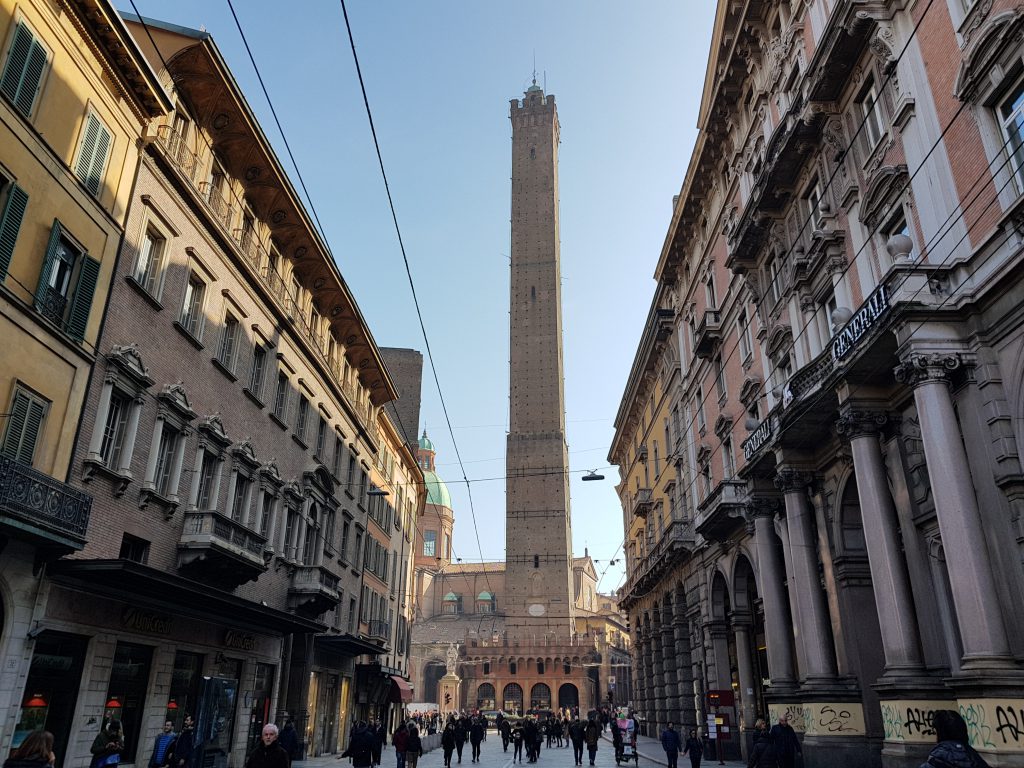 Percorriamo via Zamboni e ci dirigiamo verso il centro utilizzando come punto di riferimento le due torri di Bologna. “La Dotta”, in realtà, nel periodo medievale poteva contare circa un centinaio di torri, costruite dalle famiglie più nobili della città, e che, probabilmente, costituivano un simbolo di ricchezza e potere. Ad oggi in città si contano ancora 28 torri, ma le più famose sono sicuramente la Torre degli Asinelli e la Torre della Garisenda. La Torre della Garisenda, costruita intorno al XII secolo dalla famiglia dei Garisendi, da cui prende il nome, è la più antica tra le due ed è alta 47,50 metri. In passato, tuttavia, la torre svettava per circa 60 m ed era collegata da un ponte alla Torre degli Asinelli.