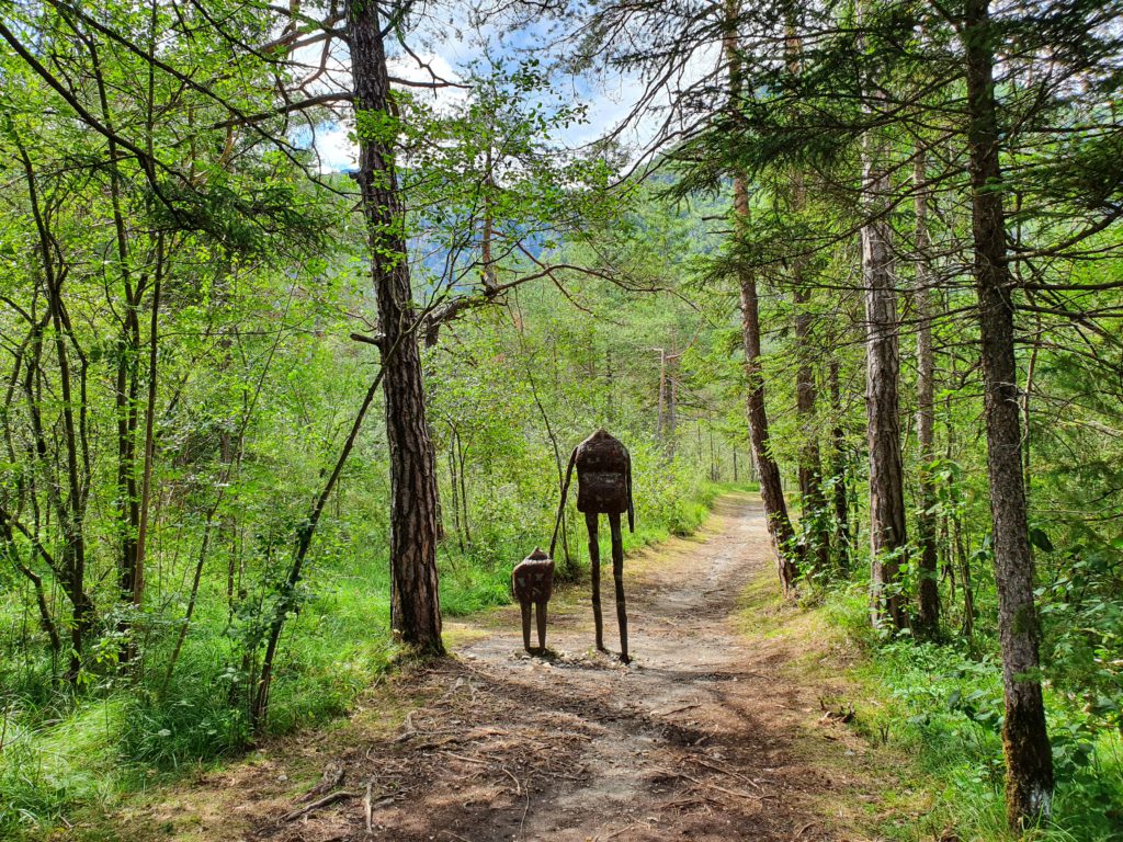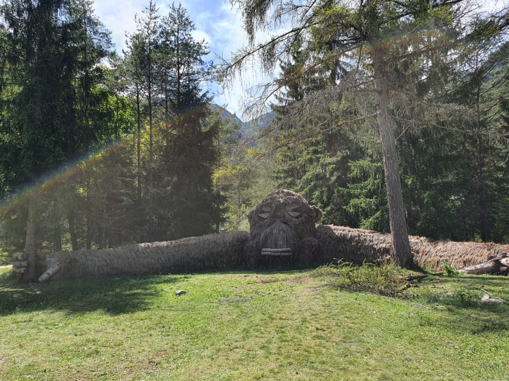 Parlando di cosa fare e vedere nella Valle di Ledro, non si può non citare Ledro Land Art, a circa 1 km da Pur. Si tratta di una passeggiata piacevole ed adatta a tutti all’interno di un bosco, lungo la quale potete ammirare sculture realizzate con materiali naturali. Le sculture sono soggette a decadimento naturale e quindi possono essere sostituite o rinnovate da un anno all’altro. Ledro Land Art può essere raggiunta a piedi dal Lago di Ledro oppure in auto. All’ingresso si trova un parcheggio gratuito e vi verrà fornita una mappa con indicate tutte le installazioni che trovate lungo il percorso. L’ingresso è libero. Il percorso dura circa un’ora, considerando il tempo necessario per ammirare le installazioni e scattare foto. La passeggiata può essere fatta anche con i bambini (la mappa segnala il percorso più semplice da fare con passeggini e carrozzine) e con i vostri amici a quattro zampe.